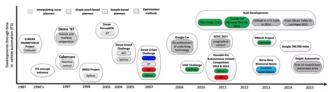 人类对自动驾驶的兴趣最早可以追溯到1925年,近年来对自动驾驶的研究热潮始于美国国防先进研究项目局(Defense Advanced Research Projects Agency, DARPA )在2004-2007年举办的3届自动驾驶挑战赛[22],如图9所示。在此之后,上文提到的各类决策规划方法的有效性都被实际验证。同时,将运动规划方法与控制理论、状态参数估计、机器学习等多领域方法相结合的解决方案也不断出现,成为未来的发展趋势: