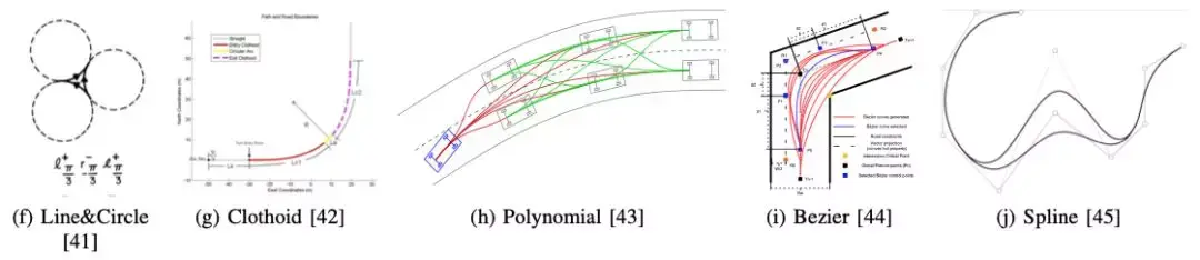如图8所示,常见的曲线有Dubins曲线(由直线和圆弧构成,是一种简单车辆模型Dubin模型在二维空间中的最短曲线族),回旋曲线,多项式曲线,贝塞尔曲线,样条曲线等。单纯应用参数化曲线构造法很难满足实际复杂场景,因此现在越来越多的自动驾驶系统将其与其他方法结合,用来对已经规划生成的轨迹做平滑处理,以满足车辆运动学与动力学约束。