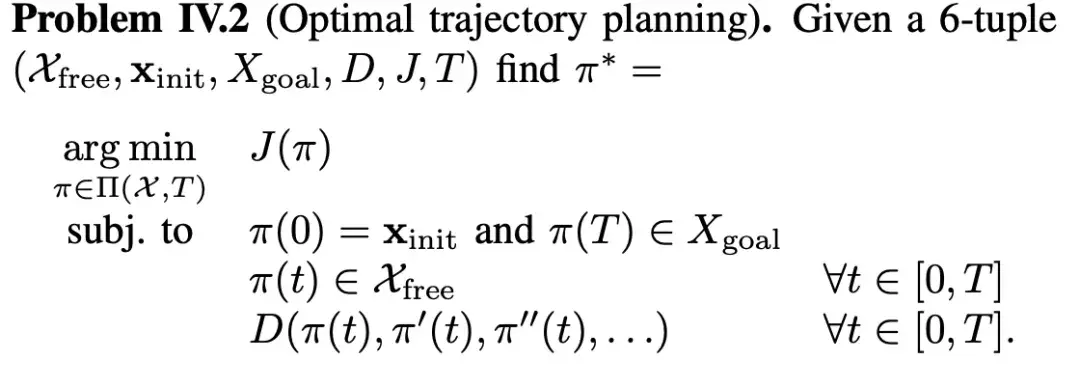在确定具体的驾驶行为之后,我们需要做的是将“行为”转化成一条更加具体的行驶“轨迹”,从而能够最终生成对车辆的一系列具体控制信号,实现车辆按照规划目标的行驶。这一过程称为运动规划(Motion Planning),运动规划的概念在机器人领域已经有较长时间的研究历史,我们可以从数学的角度将它看做如下的一个优化问题: