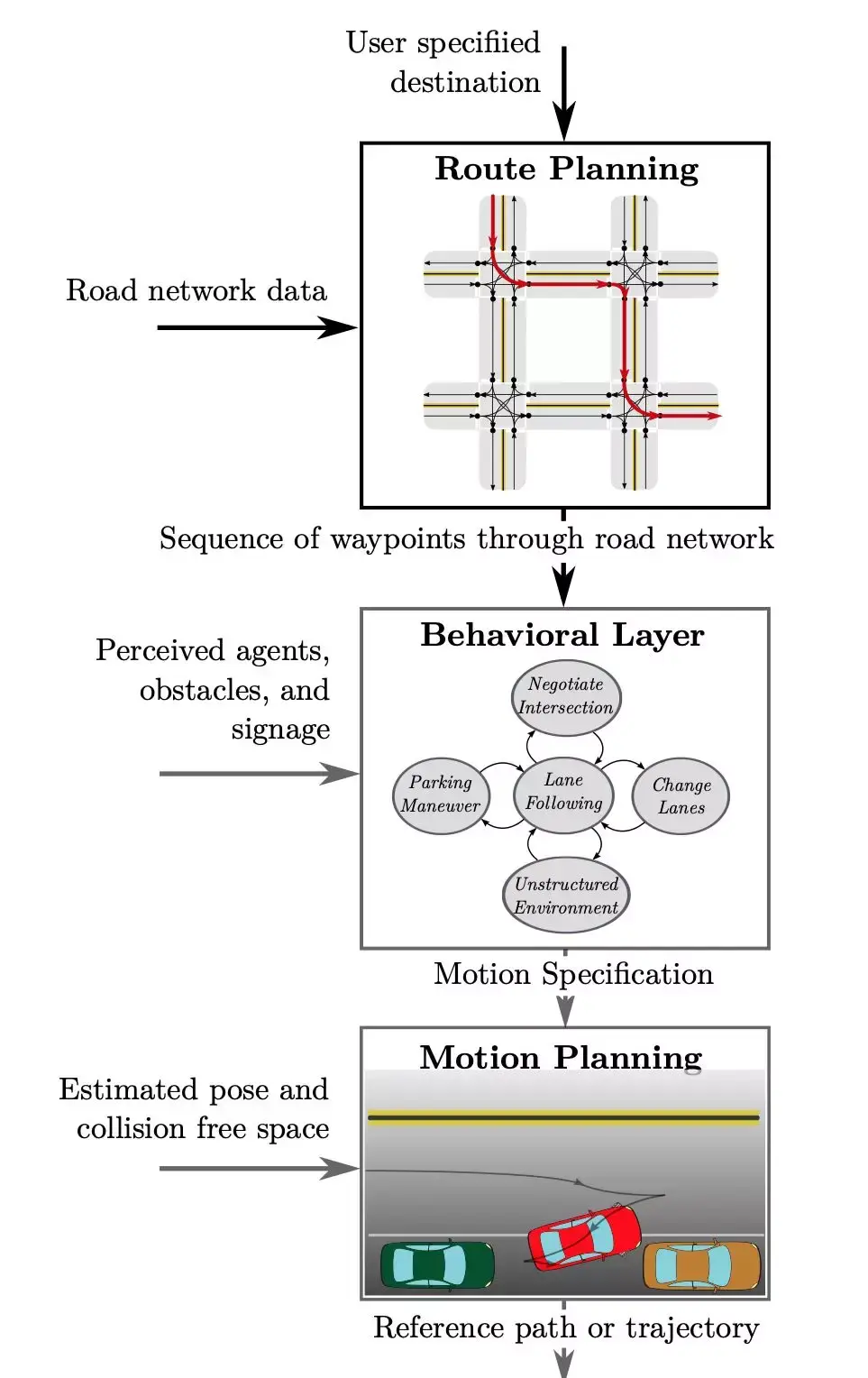最后,运动规划(Motion Planning)层根据具体的行为决策,规划生成一条满足特定约束条件(例如车辆本身的动力学约束、避免碰撞、乘客舒适性等)的轨迹,该轨迹作为控制模块的输入决定车辆最终行驶路径。