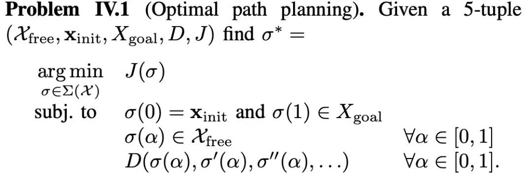 在以机器人为代表的许多场景中,我们可以认为周围的环境是确定的。在这种情况下,所谓的路径规划,是指在给定的一个状态空间Χ,寻找一个满足一定约束条件的映射σ:[0,1]➞Χ,这些约束包括: