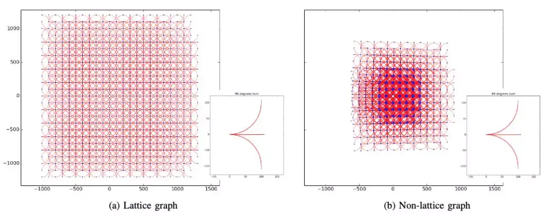 在将状态空间离散化的过程中,需要注意的是确保最终形成的栅格具有最大的覆盖面积,同时不会重复。如图5所示,左边的栅格是由直行、左转90°、右转90°这三种行为生成;而如果选择直行、左转89°、右转89°三种行为,最后就无法生成一个覆盖全部区域的栅格结构。