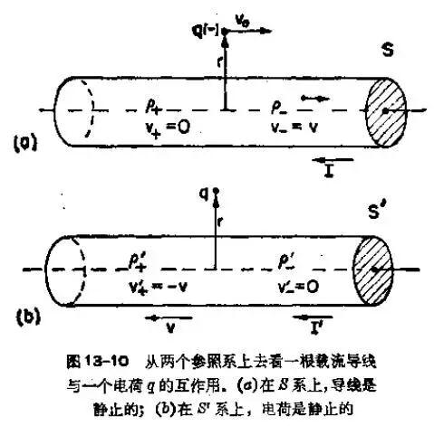 由于导线中传导电流的电子与组成晶格的金属原子相对参考系的相对速度不同。使得它们的尺缩效应也不同。于是它们分别尺缩之后导线的正负电荷就不能刚好抵消了。这样在b图的参考系下,导线上带有一个由于相对论效应产生的等效电场